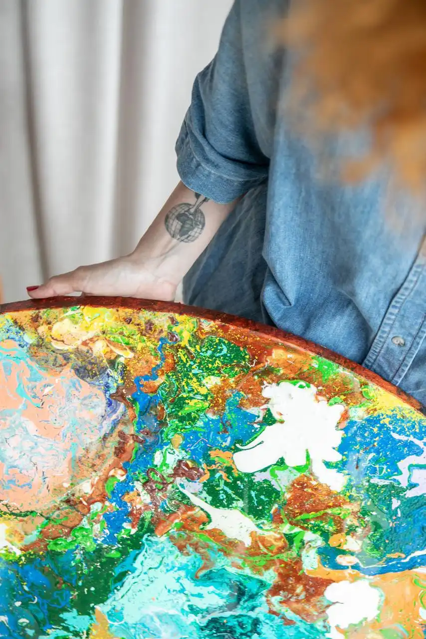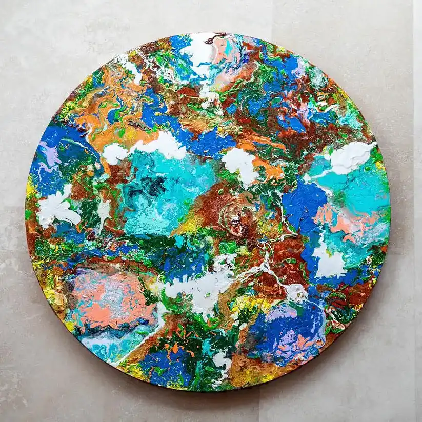 Utilizza pennelli, spatole e diverse parti del corpo, come mani, gambe, braccia, piedi e collo, lasciando che la pittura fluisca e crei un effetto di gocce, getti e linee che si sovrappongono e si intrecciano, dando vita ad un’opera d’arte vibrante, colore che scorre come un’energia mai fissa. Ogni quadro della Martinelli è un inno alla libertà, un invito a scappare dalle convenzioni sociali, perdendoci nella circolarità del tempo, nei suoi colori più profondi come fosse mare, respiro, equilibrio. Colori carichi di sfumature ondeggiano su movimenti circolari a simboleggiare la continuità, l’infinito, il passare del tempo come una costante affascinante da scoprire. Tutto torna e nulla si perde mai…