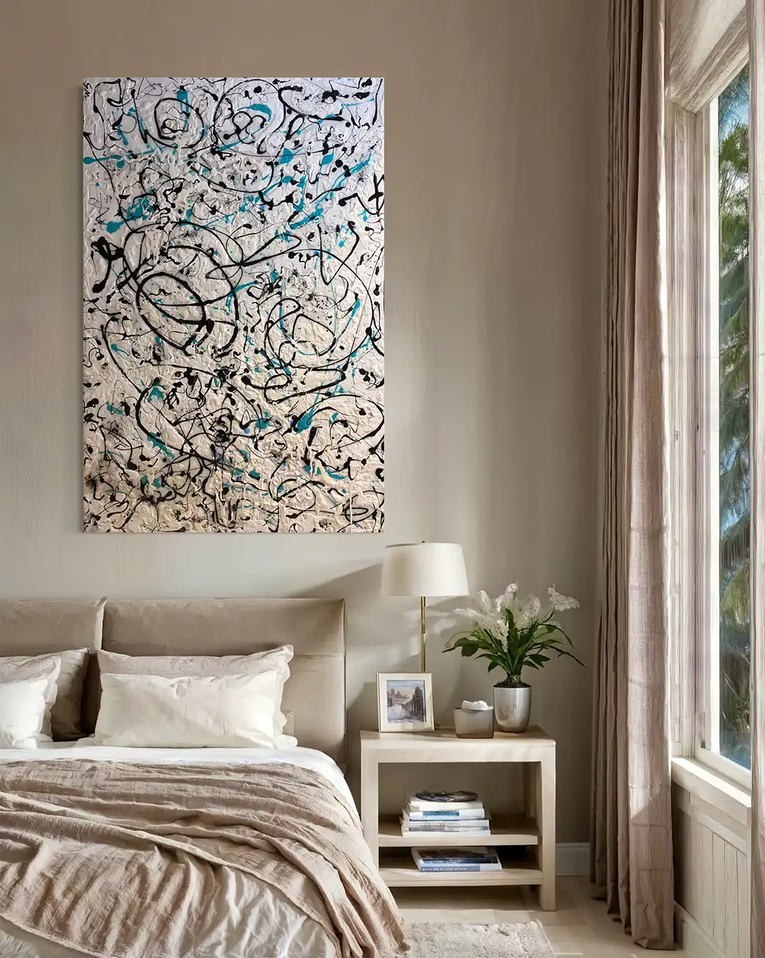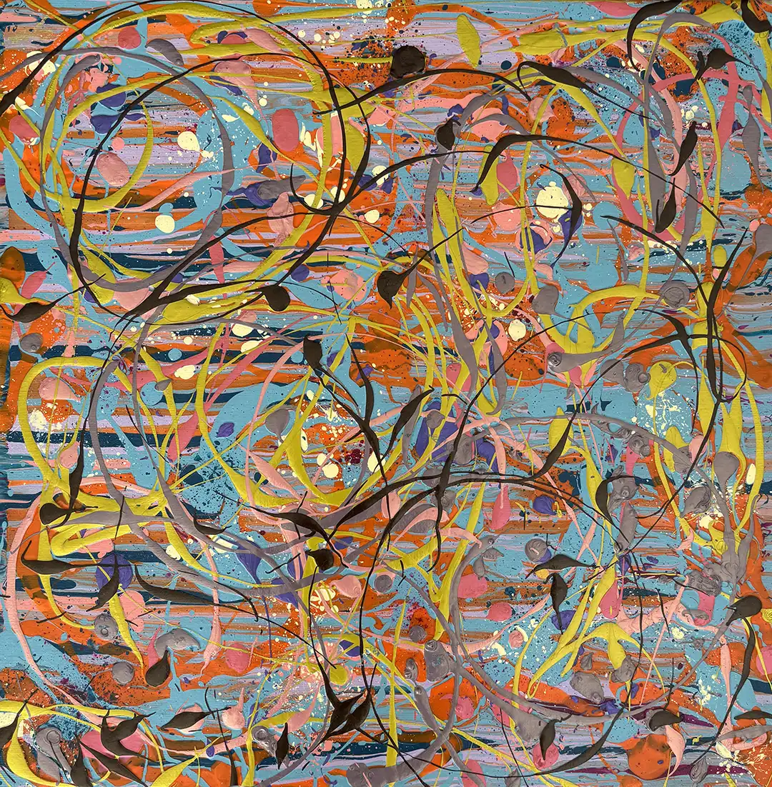 Il movimento è un elemento chiave del processo creativo dell’artista. Gabriella utilizza il corpo come strumento di espressione, immergendosi nella pittura, riproducendo gesti ampi, veloci e spontanei per creare linee, forme e texture che si sviluppano in modo organico e dinamico. La superficie diventa luogo per esprimere liberamente energia. La tela è materia. Il corpo è materia e si fa portatore di un processo, per dare vita a nuova materia, l’opera stessa.